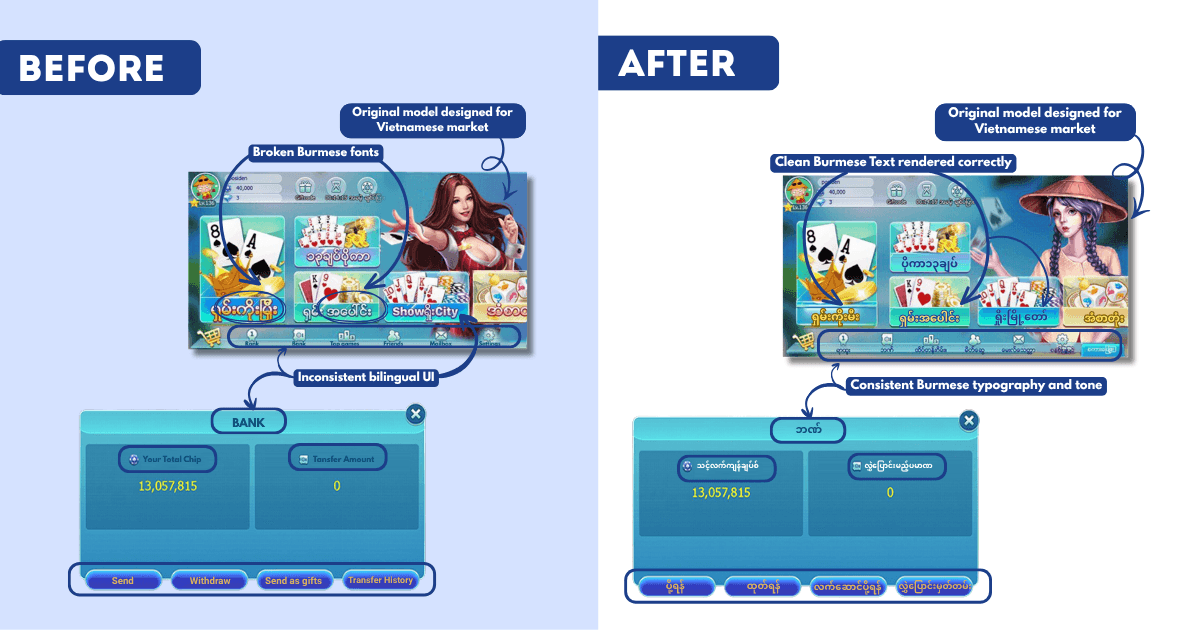 Instead of redesigning the app from scratch, I localized the existing design system, ensuring that each element from text to visuals resonated with Burmese players.