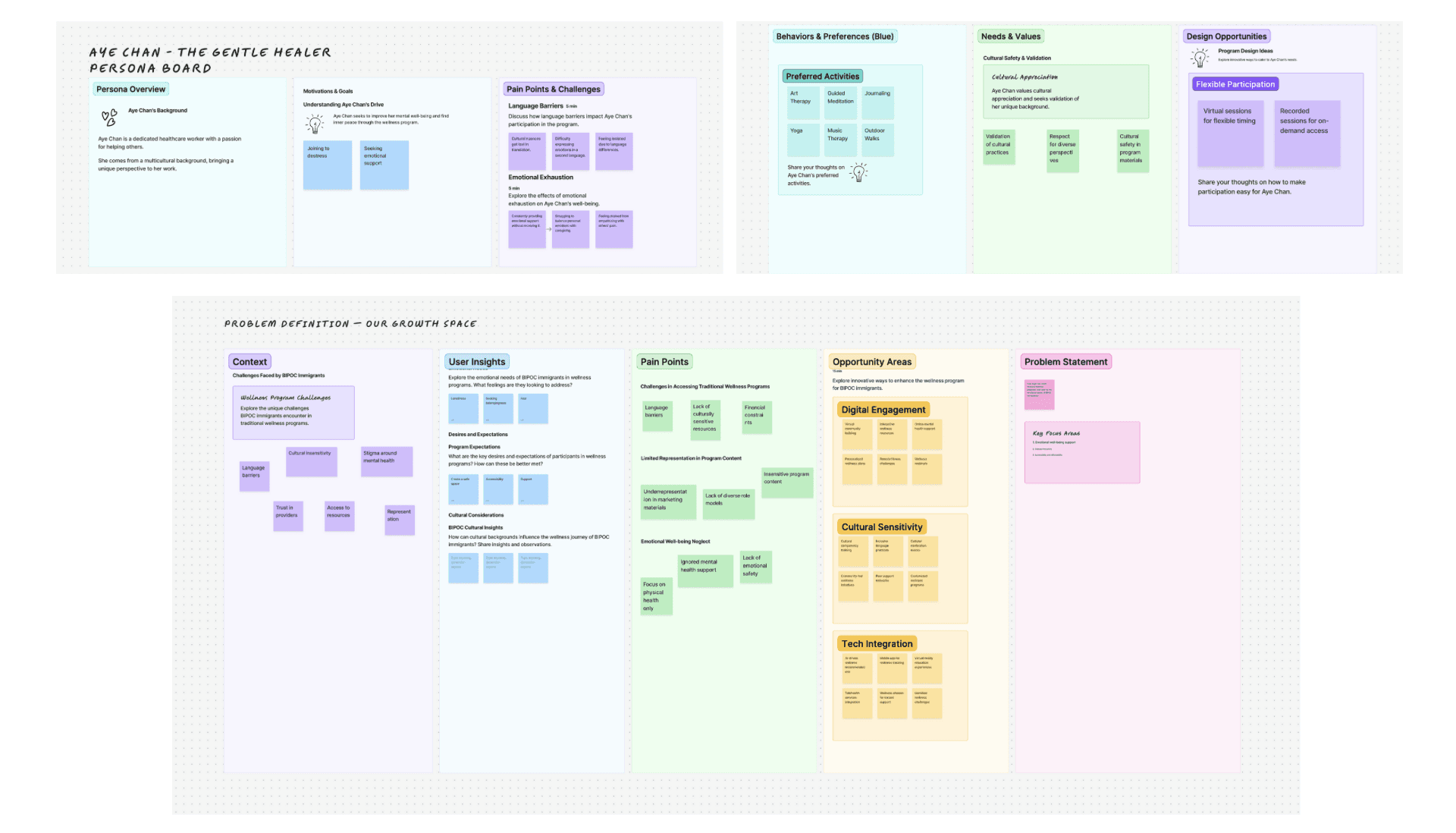 “How might we design a creative wellness program that helps BIPOC immigrants process emotions gently and build community resilience without retraumatization?”Identified success metrics tied to user behavior and engagement rather than just attendance.