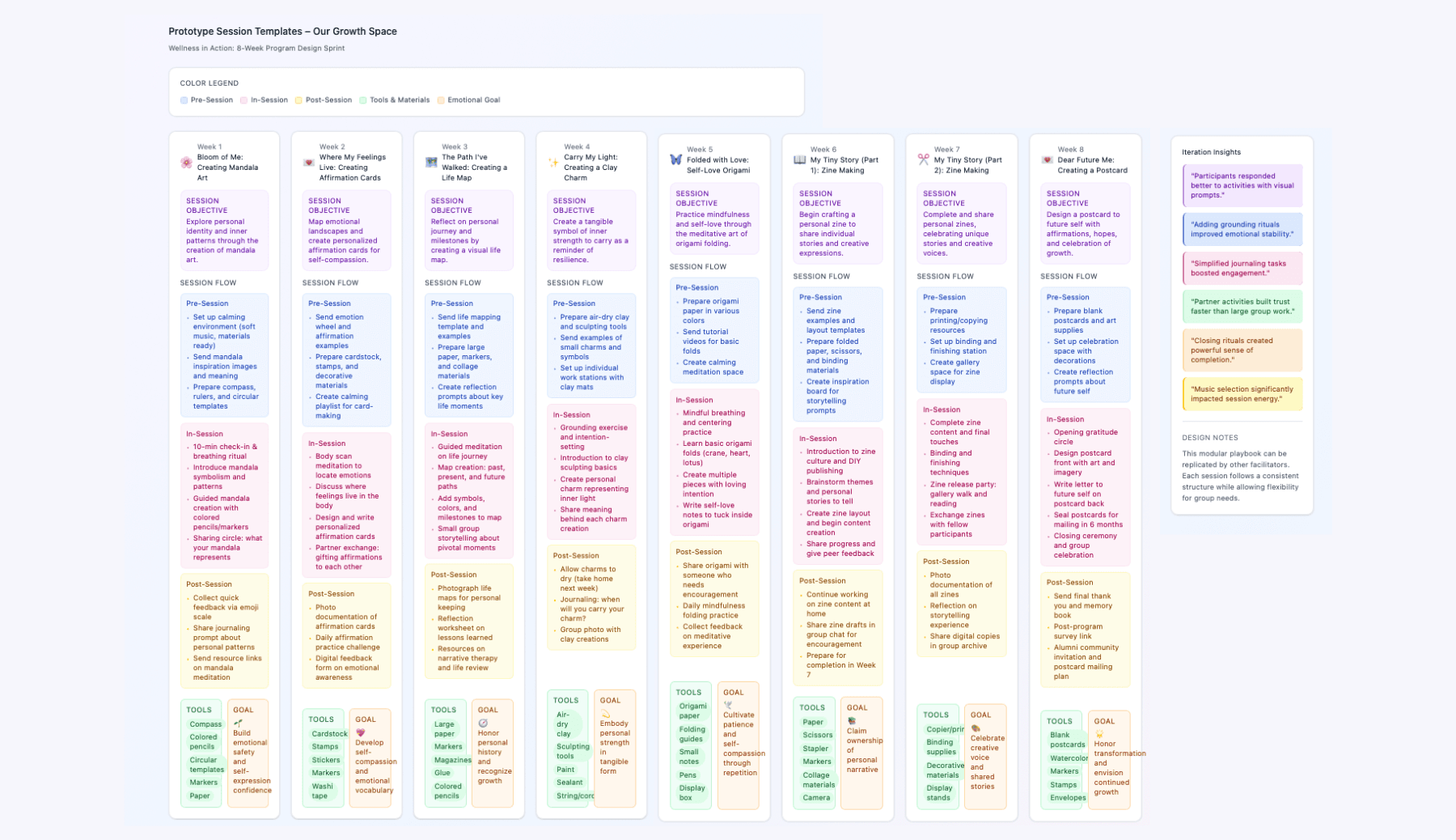 Prototyped an 8-week experience map in Miro, structured like a product lifecycle with weekly micro-themes such as Identity, Resilience, Boundaries, and Joy.